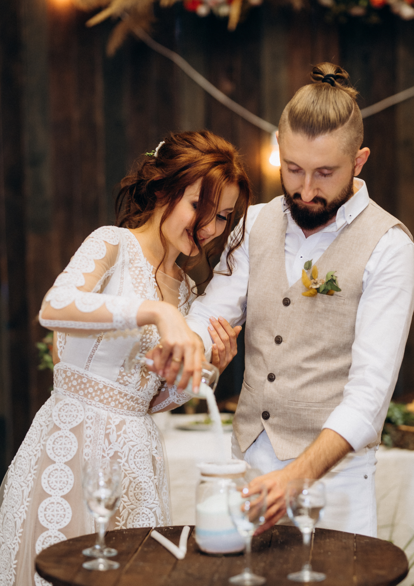 Zwei verschiedene Sandfarben werden zu einem Gefäß zu gesammelt und werden zu einem schönen Muster vereint – so wie eure Lebenswege sich verbinden. Auch Kinder oder Familienangehörige können ihren Teil beitragen, in dem weitere Sandfarben ergänzt werden.